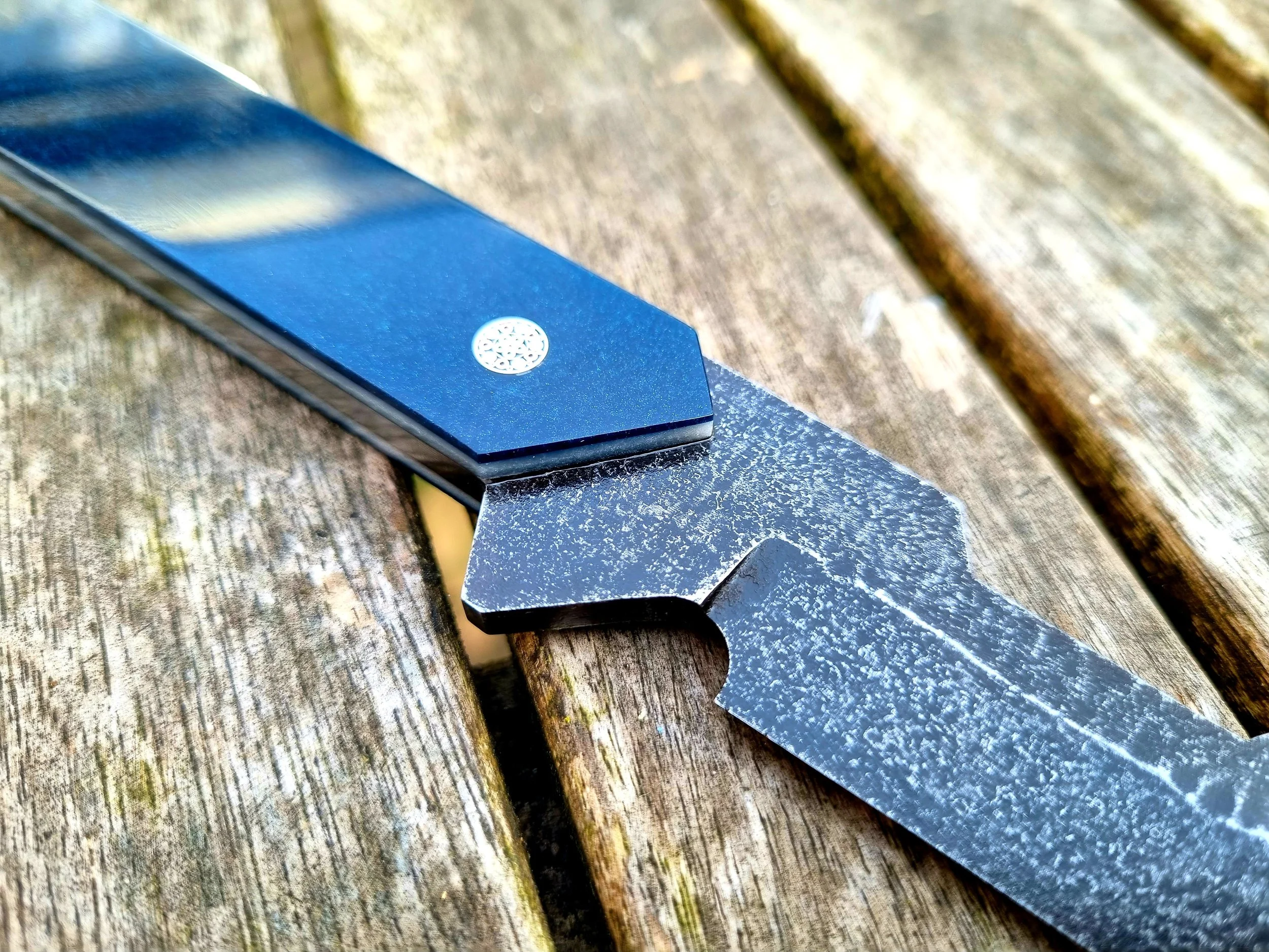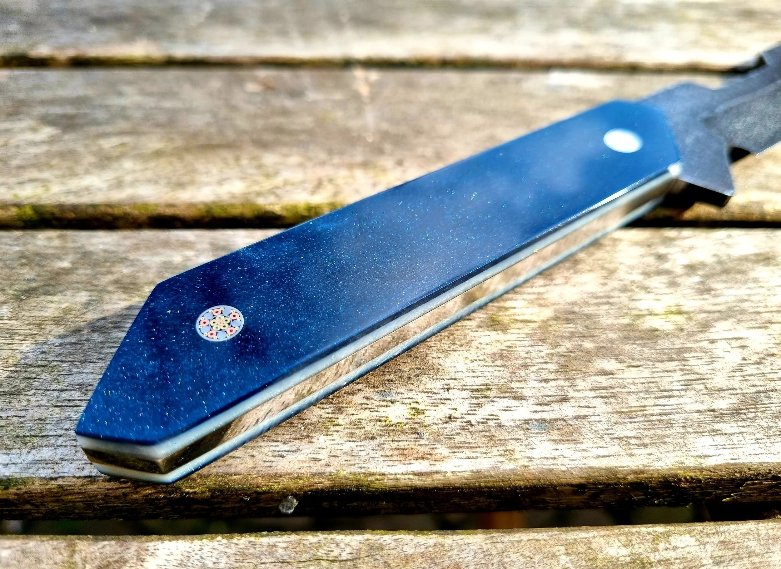 Fume blued and textured O1 tool steel. Handmade deep blue & white bicolour epoxy. Mosaic pins.